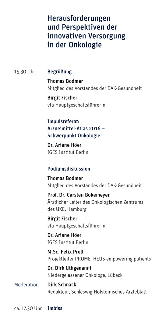 Panelists (left to right): Felix Prell (project leader PROMETHEUS), Dirk Uthgenannt (resident oncologist), Thomas Bodmer (chairman DAK health), Birgit Fischer (chief executive vfa), Ariane Höer (IGES institute), Carsten Bokemeyer (medical director cancer center UKE)
